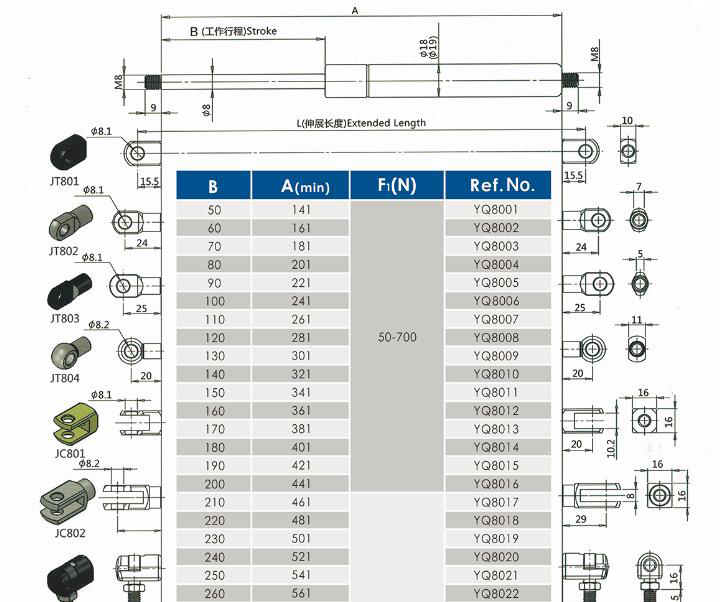 注:由于氣彈簧是非標(biāo)準(zhǔn)的,以上僅為型號的一部分。我們可以根據(jù)客戶的要求定制。